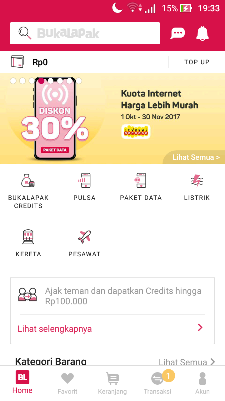 Setelah anda berhasil login, akan ditampilkan home dari situs jual beli BukaLapak.